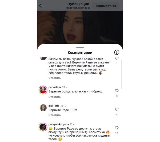 С 20 июля, по словам Рады, они с Марией разговаривают только через юристов, поэтому она не освещала эту тему ранее. Но 21 августа вся команда, кроме Воскресенской, лишилась доступа к аккаунтам брендов в соцсетях. Сама Мария утверждала, что изменила пароли и двухфакторную аутентификацию из-за того, что профили были взломаны. Но доступ женщина при этом возвращать отказалась.