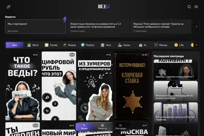 Газета «Ведомости» (АО «Бизнес ньюс медиа»; АО «БНМ») запустила новое медиа для молодой аудитории — «Веды». Говорить с читателями обещают строго на зумерском языке, рассказывая об экономике, политике, финансах, карьере, бизнесе и крипте. Все в формате коротких новостей — с эмодзи и мемами.