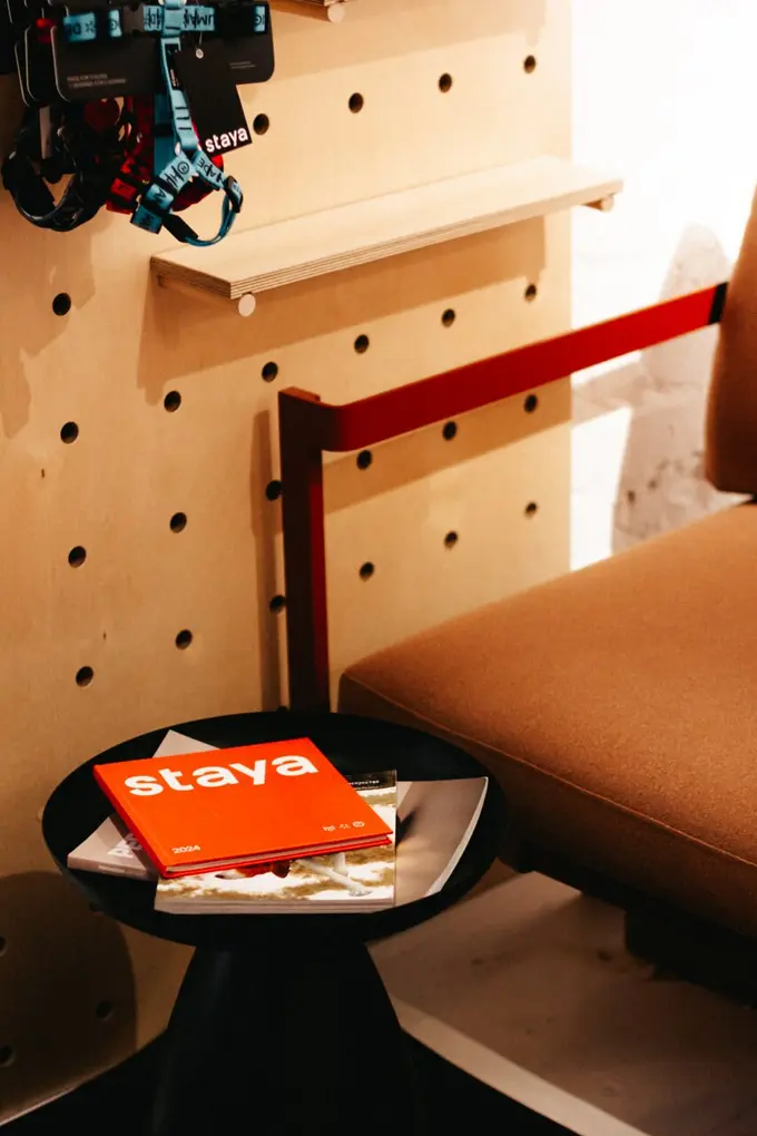 Пространство разделено на два зала: в зоне ожидания можно спокойно отдохнуть, угоститься кофе и рассмотреть амуницию, а в зоне примерки — подобрать все необходимое как для собаки, так и для себя. Сюда можно и нужно приходить с питомцами, чтобы примерить обновки на месте или, например, всего за 10 минут сделать персональный жетон в зоне кастомизации staya*tag.