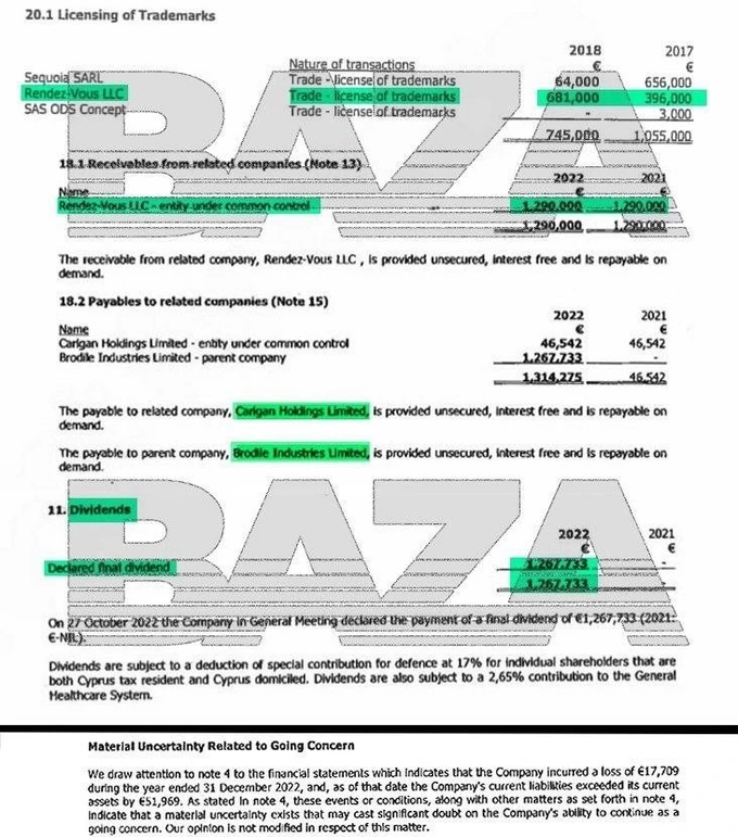 Название бренда и логотип принадлежат кипрской компании Rendez-Vous Services LTD, созданной в марте 2014 года. Российская компания выплачивала ей роялти: 396 тысяч евро — в 2017 году и 681 тысячу евро — в 2018 году. Владельцем кипрской фирмы является Brodile Industries LTD, управляемая Peritas Directors LTD, где директором указан киприот Михаил М., владеющий рядом офшоров на Кипре.