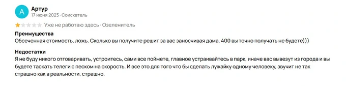 Объявление разместили владельцы «Диво Острова» — Великолукский мясокомбинат. В их профиле есть несколько отзывов, большинство из них негативные, рейтинг аккаунта составляет 1,8 «звезды». История в комментариях от Артура, работавшего там озеленителем, напоминает криминальный фильм из 90-х: