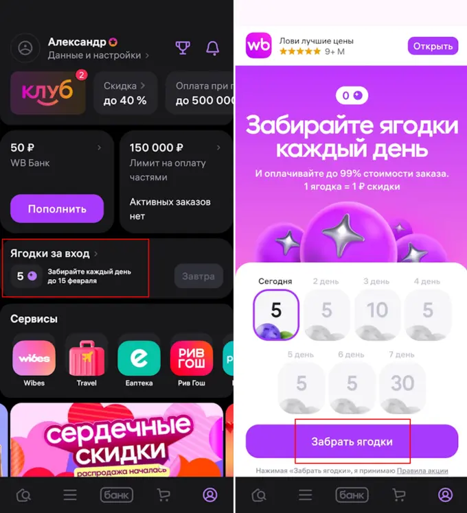 Чтобы заработать заветную валюту, необходимо открыть приложение и на странице профиля выбрать раздел «Ягодки за вход», затем нажать на кнопку «Забрать ягодки». Посмотреть баланс можно в разделе «WB Банк», баллы сгорают через год после начисления.