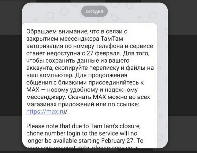 «Обращаем внимание, что в связи с закрытием „ТамТам“ авторизация по номеру телефона в сервисе станет недоступна с 27 февраля», — сказано в сообщении техподдержки. Мессенджер был запущен в июле 2016 года под названием «ОК сообщения». В мае 2017-го приложение переименовали в «ТамТам»