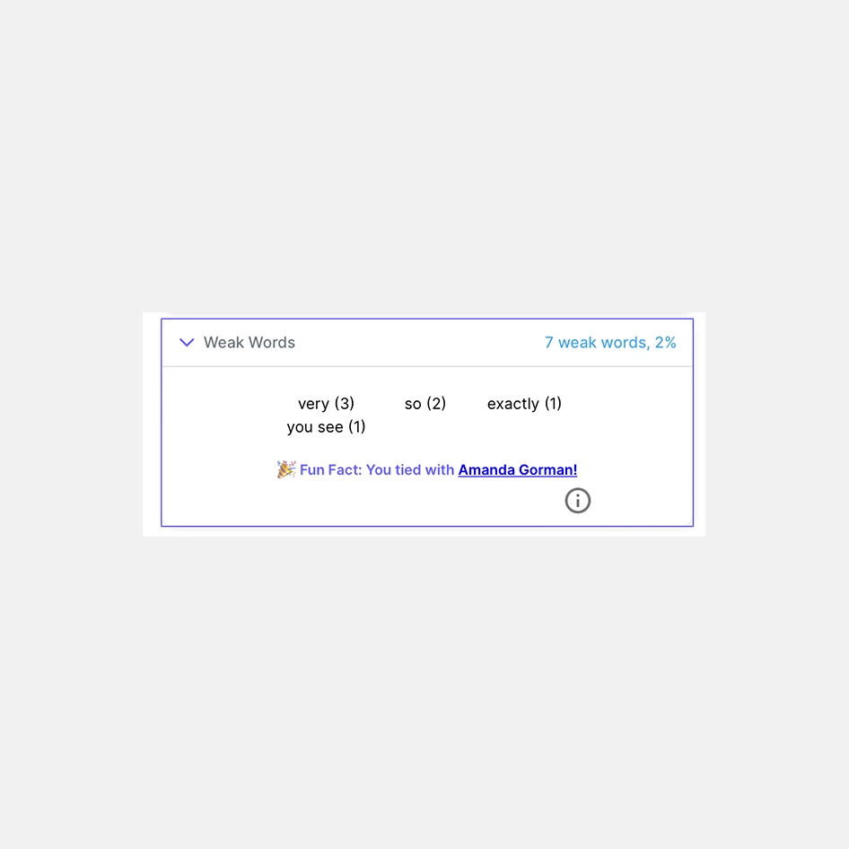 Также сервис подчеркнул «слабые слова», которых стоит избегать в разговорной речи. Например, very, so, exactly и you see. В целом функция крутая, но так как эти слова были написаны в самом тексте, а не проговорены мною лично, то мне это не пригодилось. Однако для тех, кто хочет записать монолог или поболтать на отвлеченную тему на несколько минут, будет полезно.