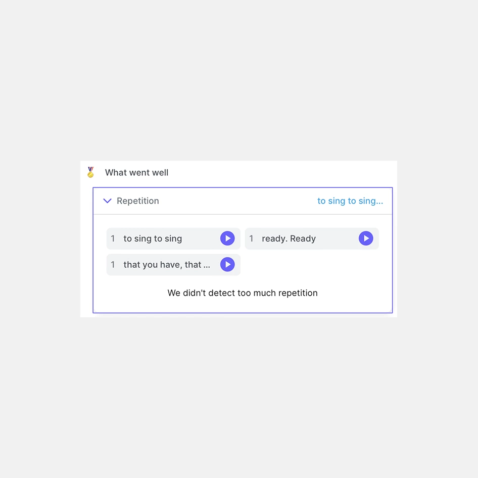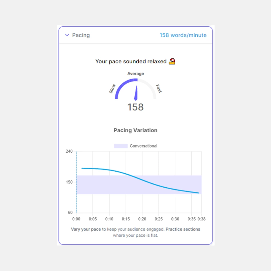 Я читала текст в первый раз, поэтому несколько раз запиналась и иногда делала большие паузы для понимания интонации. Что интересно, Yoodly выявил эти ошибки и посоветовал останавливаться на 1−2 секунды перед каждой новой мыслью, чтобы «аудитория переварила то, что я говорю». Слишком частых повторов он у меня не обнаружил.