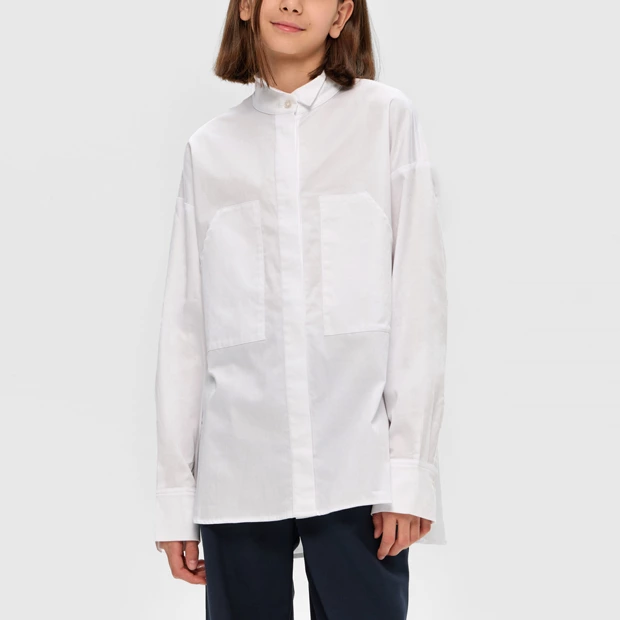 В коллекции бренда не только школьная одежда и обувь, но и аксессуары — рюкзаки, заколки для девочек и пеналы. Среди вещей особенно много блуз и рубашек. Основные цвета — белый, черный, серый и синий, также есть несколько вещей в клетку.