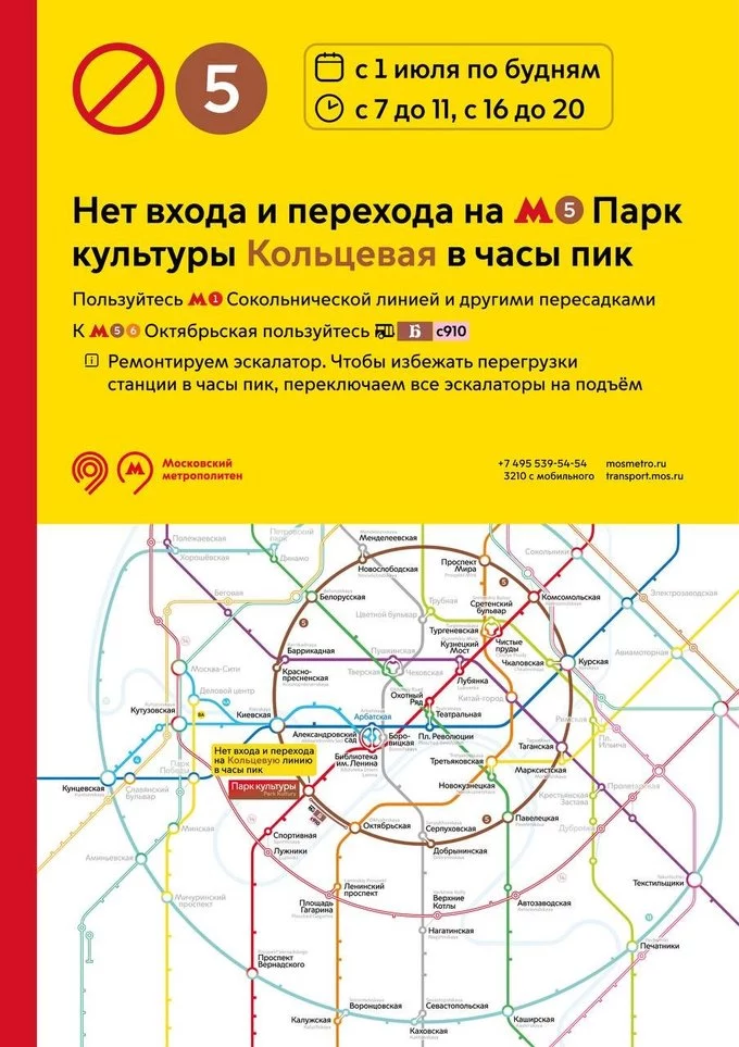 Эскалаторы на станции «Парк культуры» Кольцевой линии в часы пик будут работать только на подъем, а вестибюль будет работать на выход, пересадку и на вход на Сокольническую линию.