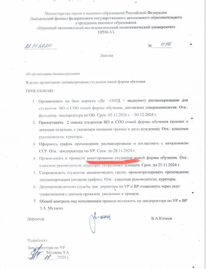 Директор филиала Пермского национального исследовательского политехнического университета в Лысове (ПНИПУ) Виктор Кочнев обязал студентов пройти неанонимный опрос по репродуктивному здоровью. Об этом сообщила глава «Лиги безопасного интернета» Екатерина Мизулина со ссылкой на приказ директора вуза.