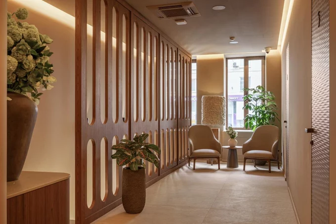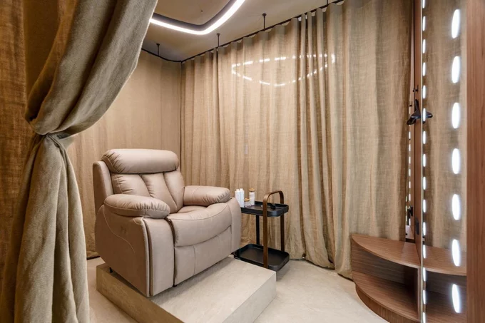 На первом этаже — большой зал, где можно отдохнуть или поработать до и после процедур, а также два кабинета для отдельных услуг (инъекционный и для новой процедуры Iyashi Dome).