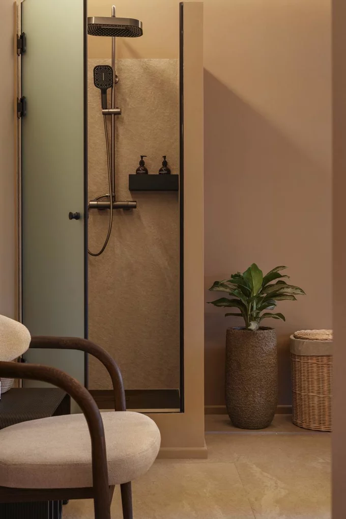 На втором этаже расположились общий зал с шестью креслами для процедур для лица, которые раскладываются до полного горизонтального положения и закрываются от остального пространства льняными шторами, и пять отдельных массажных кабинетов (четыре индивидуальных и один для парных процедур).