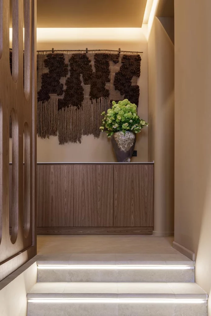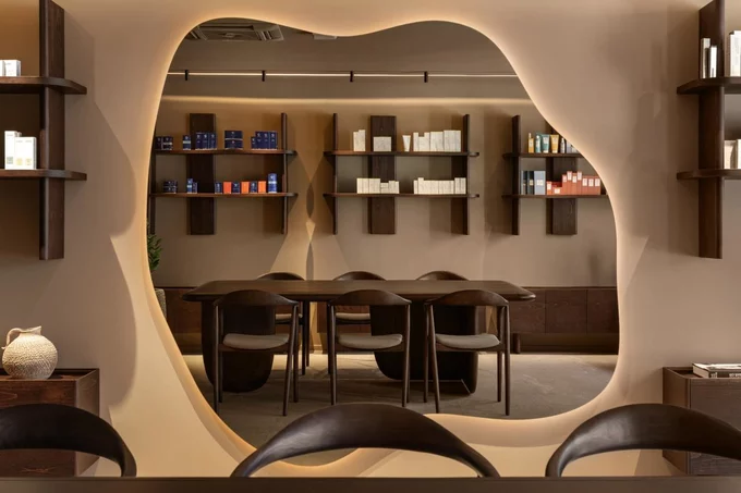 Плавный интерьер почти без углов выполнен в природных теплых бежево-коричневых тонах. Многие элементы создавались на заказ: формы для зеркал во всех кабинетах и зоне ресепшен создатели студии рисовали сами и делали под заказ — с бронзовым оттенком.