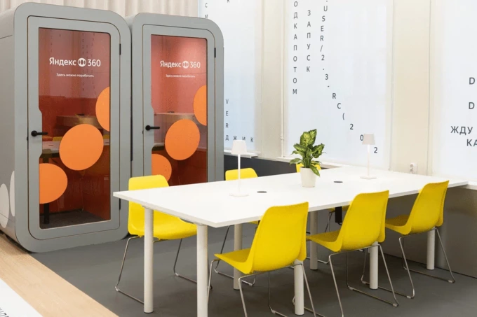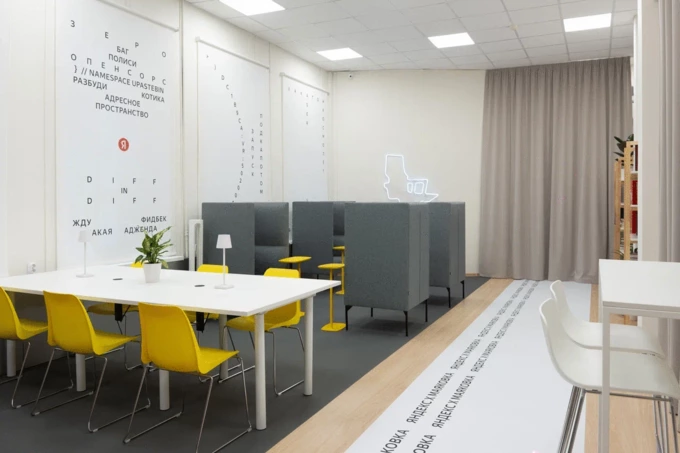 Мебель повторяет ту, которая стоит в офисах компании, включая кабинки с шумоизоляцией для созвонов. В одном из залов воссоздали кофе-пойнт для общения и перекусов. В оформлении использована «словарная масса» инженерной культуры «Яндекса», которые собрали разработчики компании.