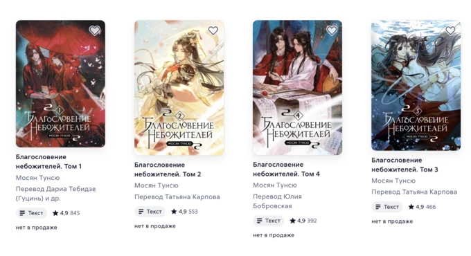 В ноябре 2024 года Министерство информации Беларуси внесло «Благословение небожителей» в список произведений, «способных нанести вред национальным интересам». Еще одну книгу Мосян Тунсю «Основатель темного пути» в апреле 2025-го искали силовики в магазине «Подписные издания» в Петербурге.