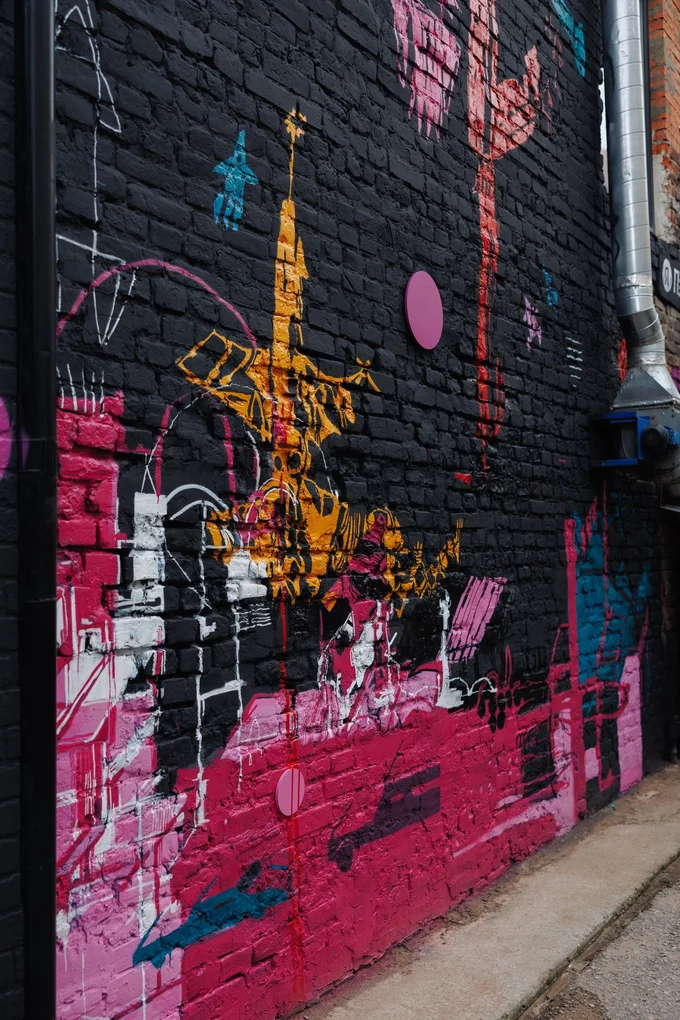 Пионер российского стрит-арта Степан Краснов и входящий в список лучших современных художников России по версии Arteex Алексей Васильев создали мурал «Космополис» во дворе «Студии 64». Работа переосмысливает фрагмент городского фасада и превращает его в картографию космического мегаполиса.
