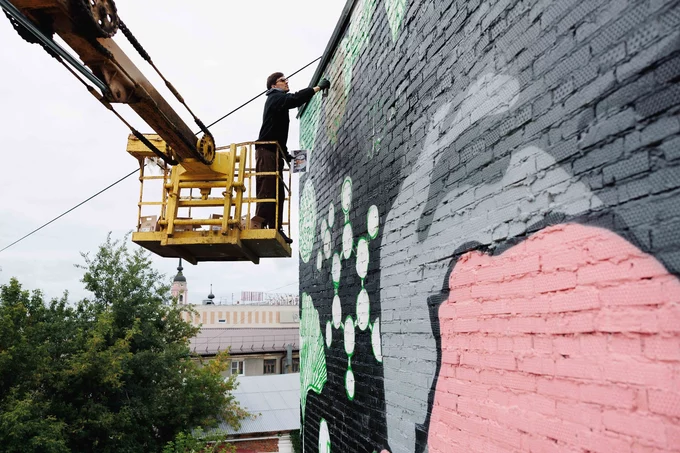 В городе также появились работы, созданные в коллаборациях местных и московских художников. Так, создатель крупнейшего в мире мурала в 10 тысяч квадратных метров Миша Most и калужский автор Юлия Агеносова на фасаде школы № 5 изобразили портрет Александра Чижевского.