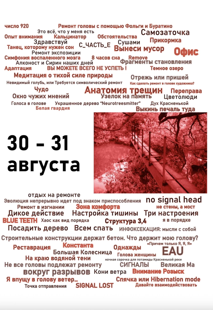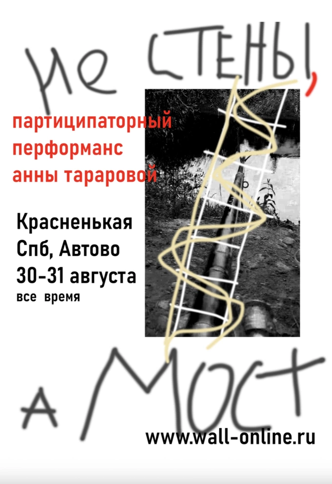 - Интерактивный коллективный перформанс «Не стены, а мост» — художница будет плести или вязать мост над Красненькой из лыка как символ единства и поддержки связей. Каждый зритель или художник может присоединиться.