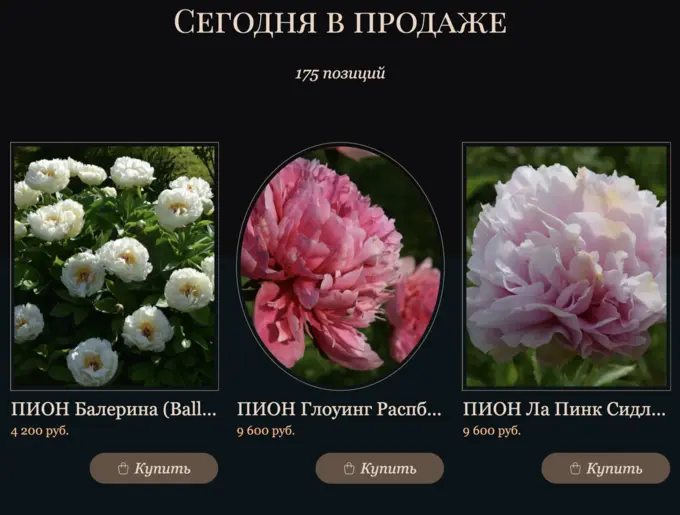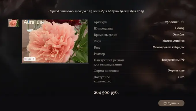 Стоимость зависит от сложности селекции, уникальности сорта, декоративных характеристик и спроса. Рекордной позицией на Octirium уже стал пион «Marcus Aurelius» — сорт, названный в честь римского императора. Его стоимость — более 260 тысяч рублей.