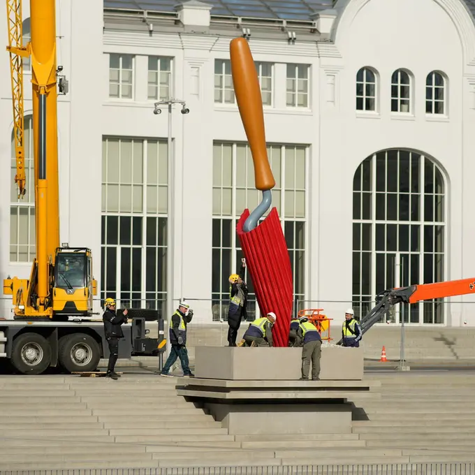 Скульптуры Олденбурга и ван Брюгген всегда располагаются в открытых пространствах: за счет игры с формой и содержанием они меняют привычный ландшафт, стирая границы между реальностью и воображением. Вот и скульптура в виде садового инструмента увеличена во много раз.