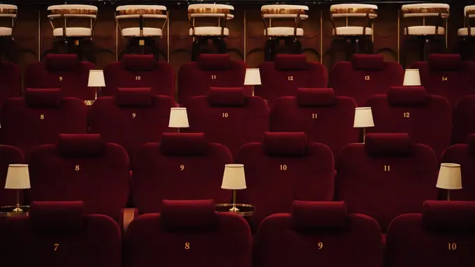 В зале, рассчитанном на 96 зрителей, поставили двухместные бархатные кресла с подголовниками и маленькими столиками. На верхнем ярусе организовали бар: за полчаса до сеанса гостей ждут на коктейльный аперитив и закуски.