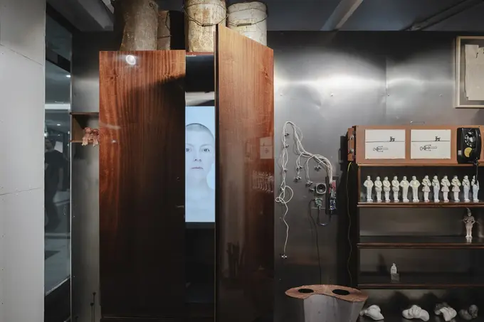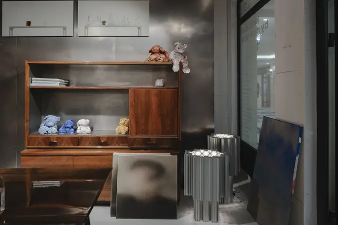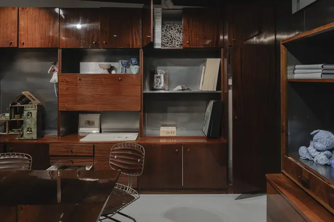 Пространство напоминает музей советского быта: витринами для произведений комиссионки стали характерные деревянные стенки. Только стоят на полках не хрусталь и книги, а предметы современного искусства.