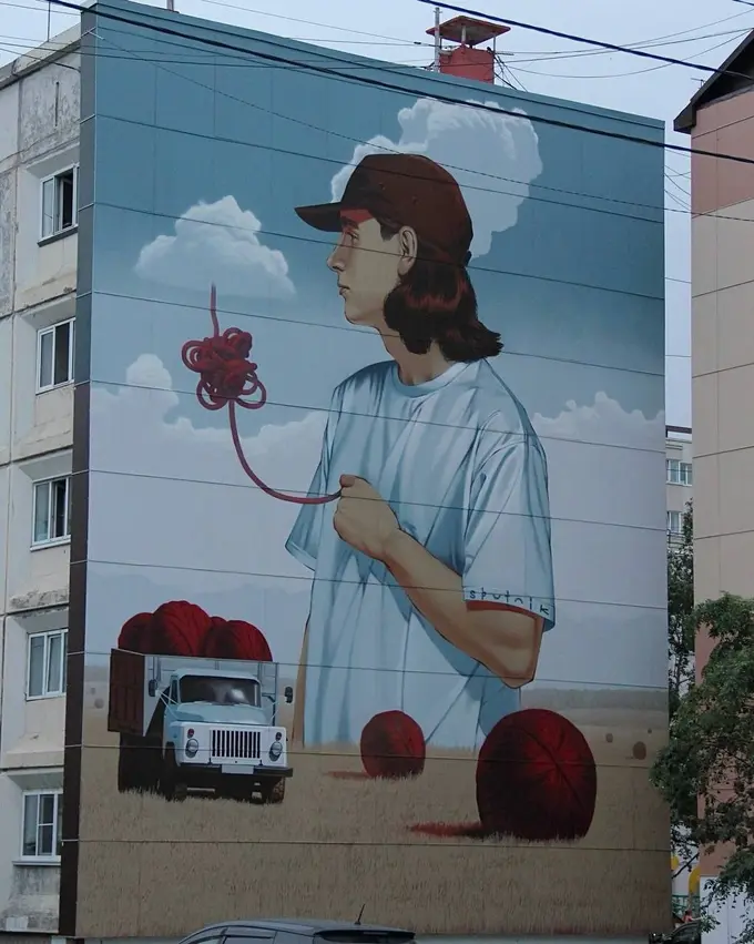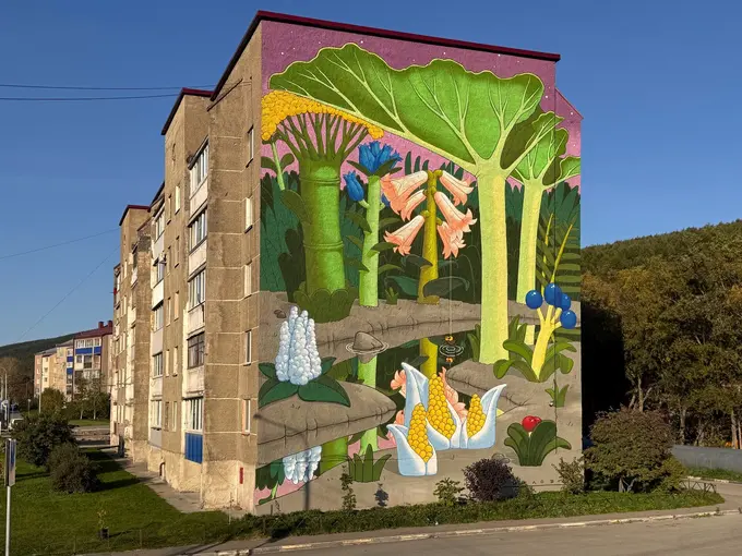 В рамках второго сезона паблик-арт программы «Взгляды» в Южно-Сахалинске появилось 25 новых муралов от 12 художников из России, Кыргызстана и Швейцарии. Темой сезона стала «Система координат» — художникам предлагалось осмыслить, как искусство в городе может стать не только визуальным ориентиром, но и способом считывать связи в городской среде.