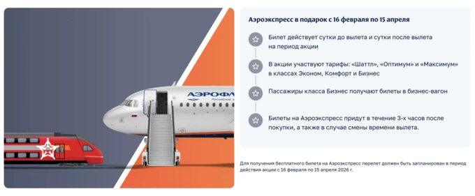 Перелет должен быть запланирован именно в период действия акции. Билеты на «Аэроэкспресс» придут в течение трех часов после покупки, а также в случае смены времени вылета.