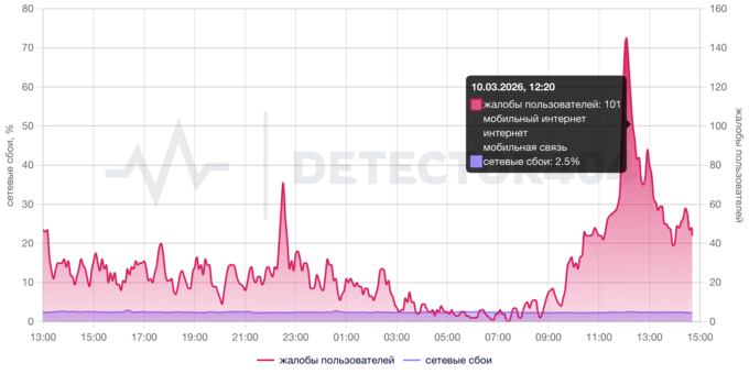 В Москве уже несколько дней нестабильно работает мобильный интернет и связь. Сервис мониторинга сбоев Downdetector фиксирует более 2 тысяч жалоб пользователей к полудню 10 марта. Источники газеты «Коммерсантъ» 6 марта предупреждали, что операторы связи ограничивают работу интернета в отдельных районах города специально — по распоряжению властей.