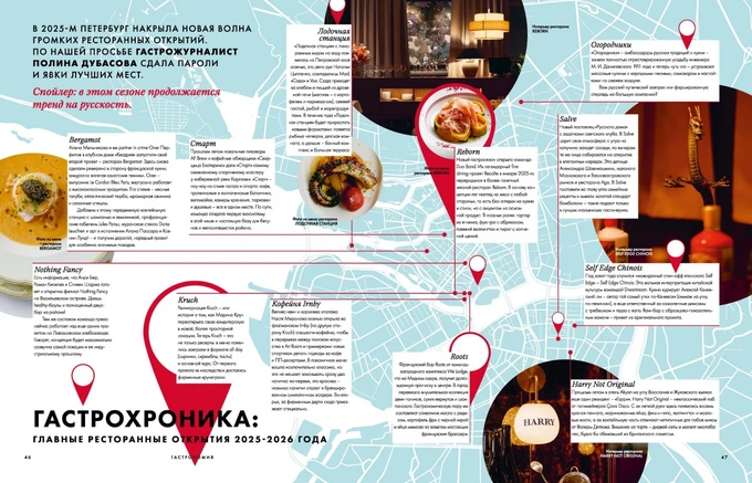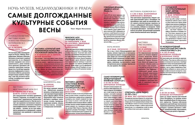 Команда редакторов по знакомым формулам собрала ожидаемые культурные события города (выпуск рассчитан до конца мая), новинки локальных петербургских брендов одежды и косметики, за которыми предлагают следить, а также новости местных ресторанов.