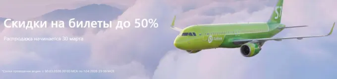 Авиакомпания S7 Airlines объявила распродажу: с 30 марта по 1 апреля билеты по России и за границу будут продаваться со скидками до 50 %. Бронировать перелеты туда и обратно по акции можно на любую дату, начиная с 6 апреля.