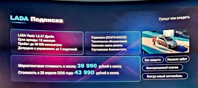 Подписка на Lada Vesta предполагает срок аренды на один год и пробег до 30 000 километров. Маркетинговая стоимость составляет 39 990 рублей в месяц, а «стоимость с 20 апреля 2026 года» — 43 990 рублей в месяц.