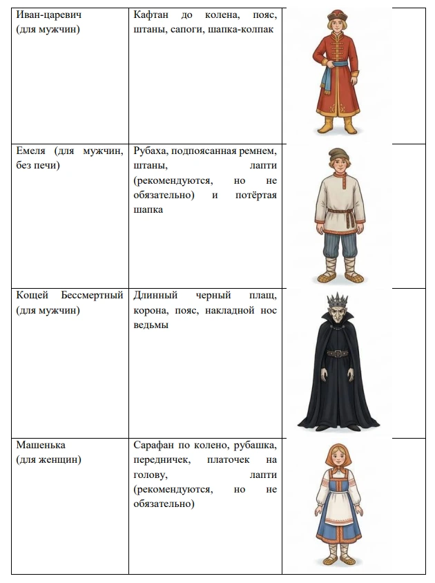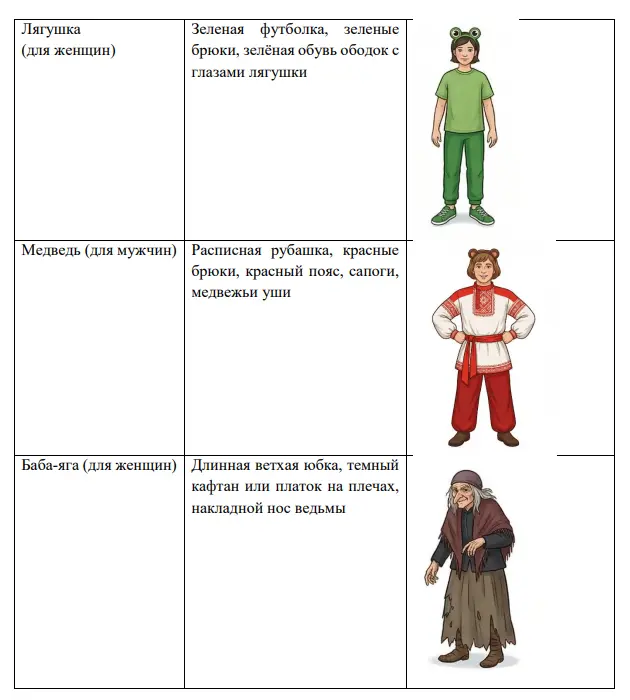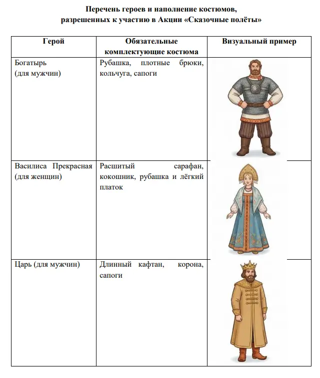 В образе Богатыря, Царя, Ивана-царевича, Емели, Кощея и Медведя может лететь только мужчина, в образе Василисы Прекрасной, Машеньки, Лягушки и Бабы-яги — только женщина.
