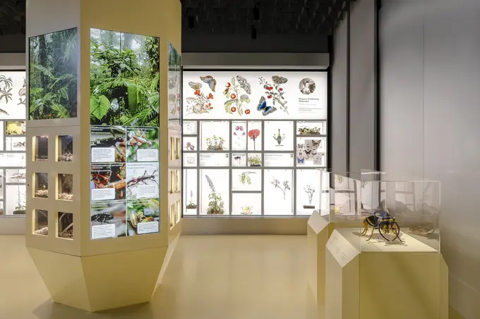 Основная зона находится в правой части павильона — здесь собраны макеты разнообразных насекомых: пчел, палочников, сверчков и других видов. Всего выставлено более 1 100 экспонатов.