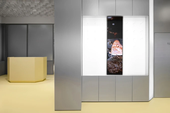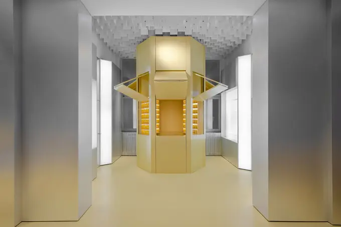 В материалах преобладает желтый цвет, вдохновленный работами художника Вольфганга Лайба, который создает инсталляции из пыльцы. В этом цвете выполнены пол, витрины и элементы мебели.