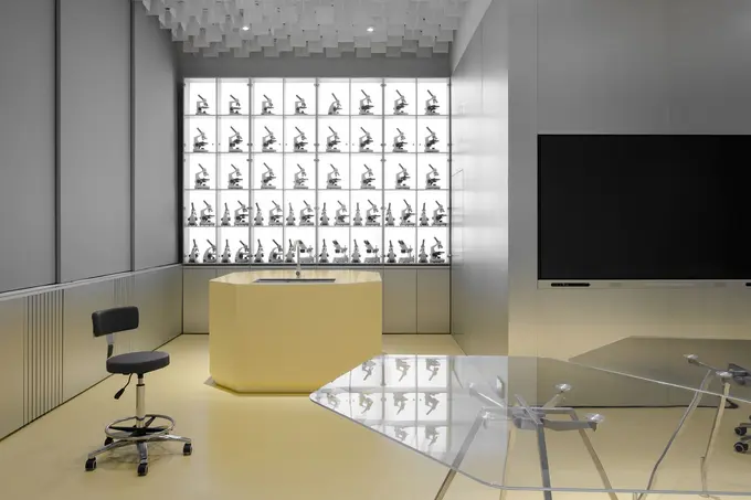 Форма шестигранника — отсылка к пчелиным сотам — повторяется в медовом киоске, витринах и столах лаборатории, а скошенные края проходят лейтмотивом через все объекты, обратили внимание в .dpt. Кроме того, центральная изогнутая металлизированная стена напоминает спинку жука-скарабея.