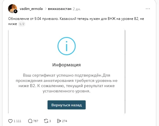 Первым 10 апреля об ужесточении требований написал пользователь Threads*. Он получил отказ в виде на жительство на сайте Kazakhstan Migration из-за того, что его уровень знания казахского «ниже установленного уровня» (B2). О новом правиле также сообщила одна из пользователей TikTok Виктория Юхлина.