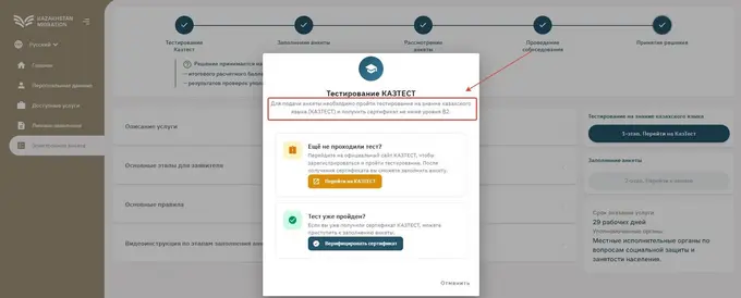По ним, соискателю нужно подтвердить уровень знания казахского (A1), заполнить оцениваемую анкету, пройти собеседование со спецслужбами и предоставить либо письменное согласие от страны гражданства на ВНЖ, либо «листок убытия», а также договор аренды и подтверждение платежеспособности.