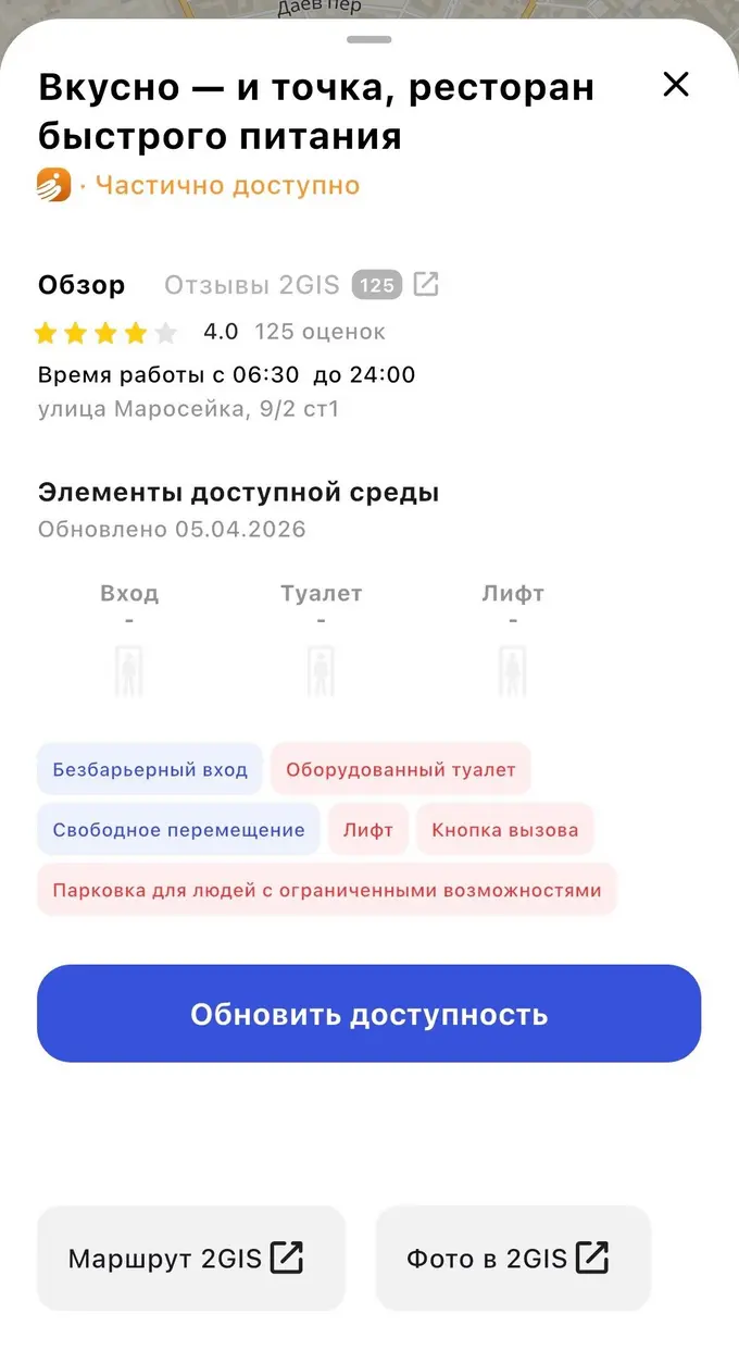 Добавлять и проверять точки могут не только люди на колясках, но и любые пользователи. Для этого нужно заполнить анкету с фото, после чего данные проходят модерацию и сверяются с другими отзывами, чтобы обеспечить точность информации.