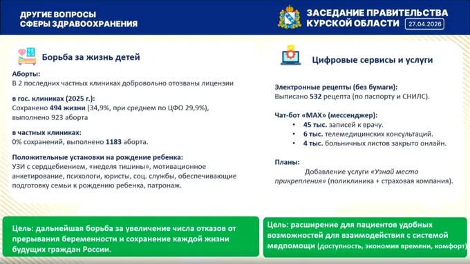 «Безусловно, право каждой женщины, каждой семьи на прерывание беременности остается за ними. Здесь каждый решение принимает сам, государство не вправе запрещать что-либо. Но государство должно сделать максимум для того, чтобы убедить и отговорить женщину от искусственного прерывания», — заявил губернатор Курской области Александр Хинштейн.