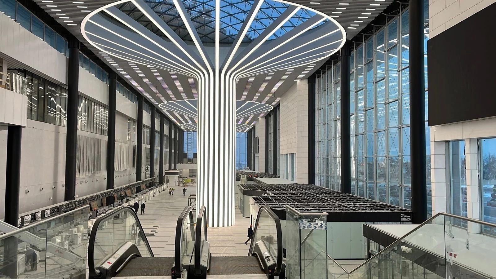 Общая площадь нового терминала — 58,3 тысячи квадратных метров, а высота потолков — 30 метров. У здания шесть телескопических трапов и 54 стойки регистрации. В центре терминала установили конструкции, которые напоминают турбины самолетов. По данным НГС, они будут светиться.