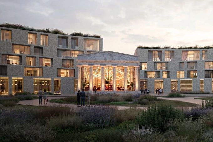 За колоннадой начнется более камерная часть комплекса — зона санатория и спа. Здесь появятся бассейны, термальные источники разных температур и рекреация. Такое разделение позволит сформировать разные сценарии использования территории: кто-то сможет провести здесь несколько часов, а кто-то — приехать на длительный курс восстановления.