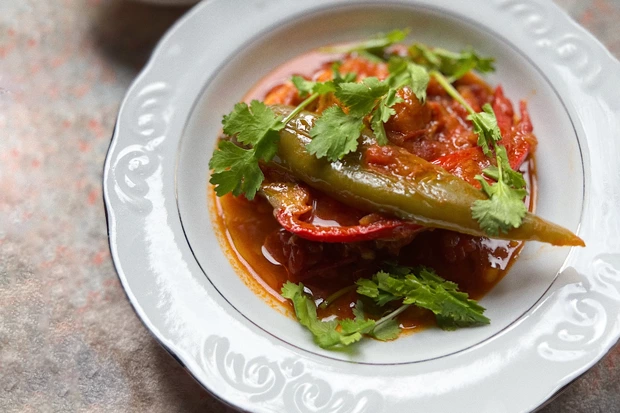 Обжариваем лук, добавляем слайсы чеснока, томатную пасту и смесь специй. Немного обжариваем вместе с луком, чтобы специи раскрылись. Далее добавляем томаты и воду и немного томим, следом кладем зеленый и красный чили, очищенный от семян, и кусочки филе сибаса, готовим минут 7–8 и доводим до вкуса солью и сахаром. Подаем горячим.