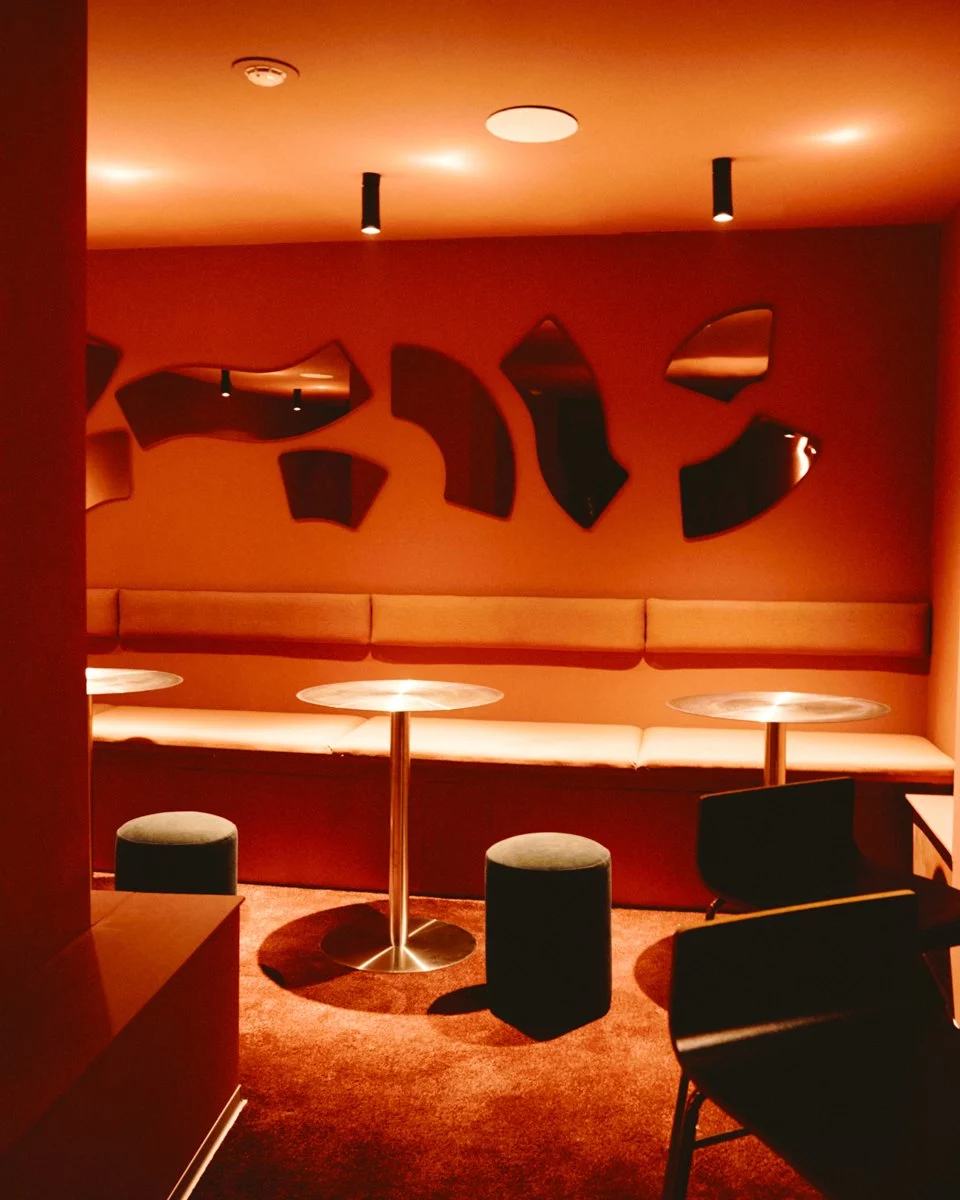 Начинается все с яркой рубиновой двери, которая ведет вас по крутой лестнице вниз — с количеством коктейлей будьте осторожны, по этой же лестнице вам потом и выходить. Планировка помещения напоминает структуру бутик-отеля: на входе вас встречает «стойка регистрации» и бар, по бокам расположены пять приватных караоке-комнат, каждая из которых выполнена в своем стиле, а по прямой — лобби, где можно расположиться с коктейлем и послушать живое выступление самых смелых из посетителей.