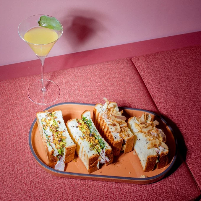 Уравновесить яркость коктейлей можно закусками от бренд‑шефа Александра Нечаева. Меню кухни выстроено вокруг сэндвичей сандо на хлебе хоккайдо собственного производства: с тамаго и сибулетом был довольно сытным и с ровным сливочным вкусом, еще есть с тунцом и мисо-пастой, окороком с песто из рукколы и ментайко с тобико и васаби. Также есть закуски на зубок: орехи в меду, битые огурцы, пастрами и гребешки с гелем из цитрусов.
