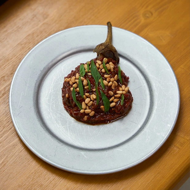 Печеный баклажан, соус сальса негра, кедровый орех, хуакатай — 950 рублей