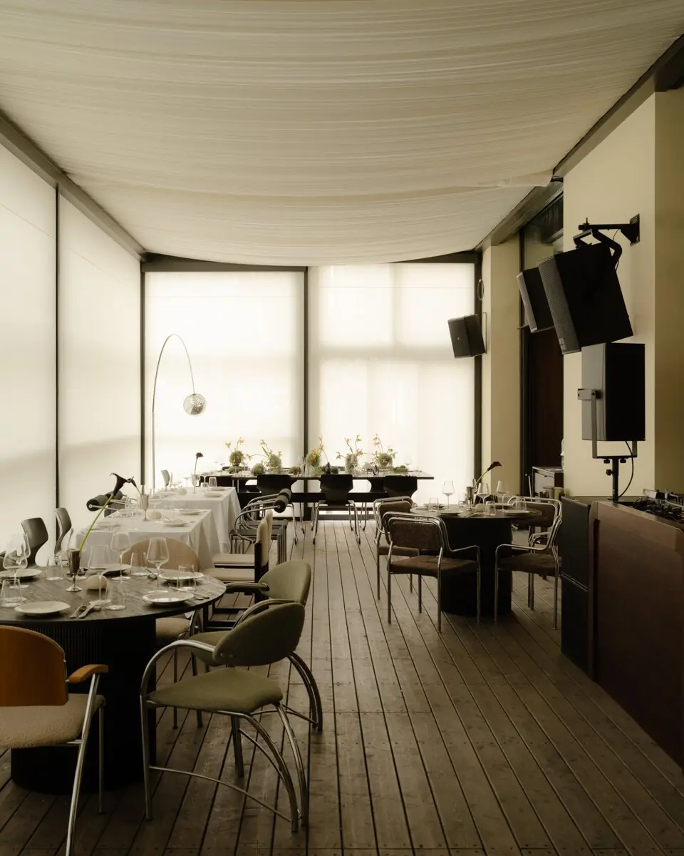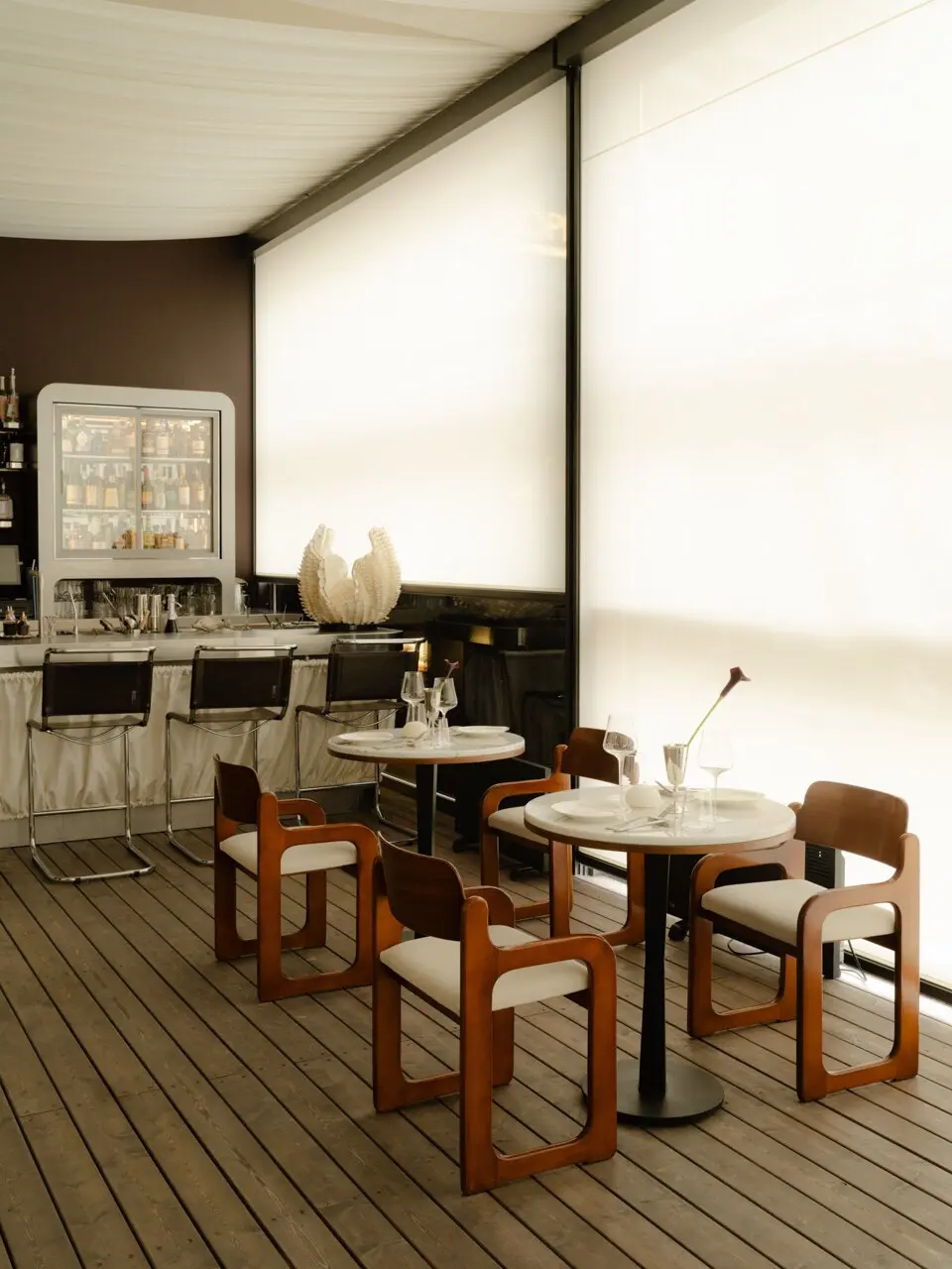 Дизайн работает на атмосферу то ли яхты, то ли пятизвездочного отеля где-нибудь в Порто-Черво. Воздушные полотна под потолком намекают на ветер в парусах, палубная доска под ногами ведет по воображаемому пирсу, а шторы в гардеробе мерцают, как рыбья чешуя. Не самый остроумный штрих — номерки для одежды из настоящих ракушек, созданные в коллаборации с ювелиром Александром Карпинским. Во всем продуманном до мелочей пространстве они смотрятся нарочито небрежно и немного наивно.