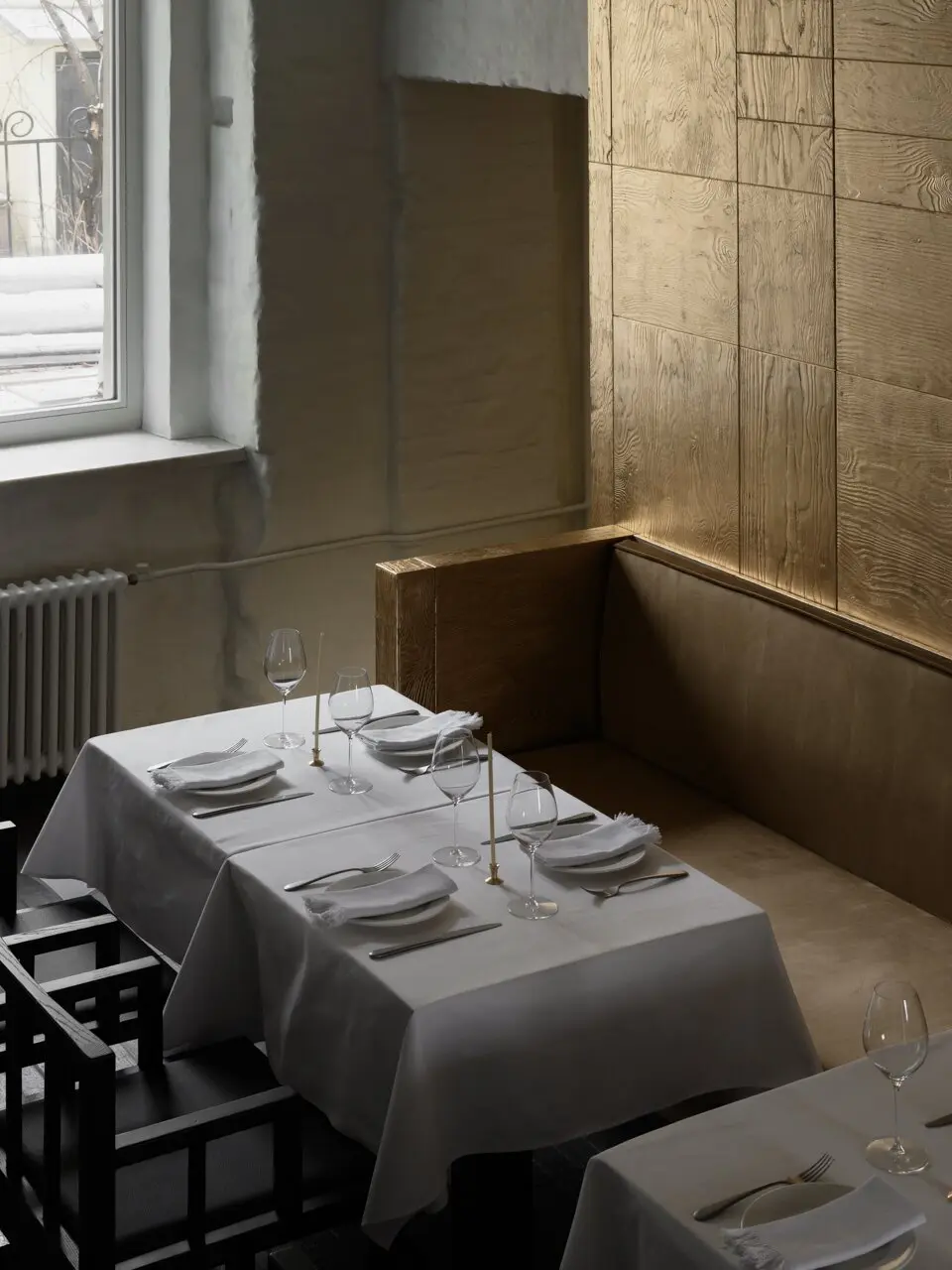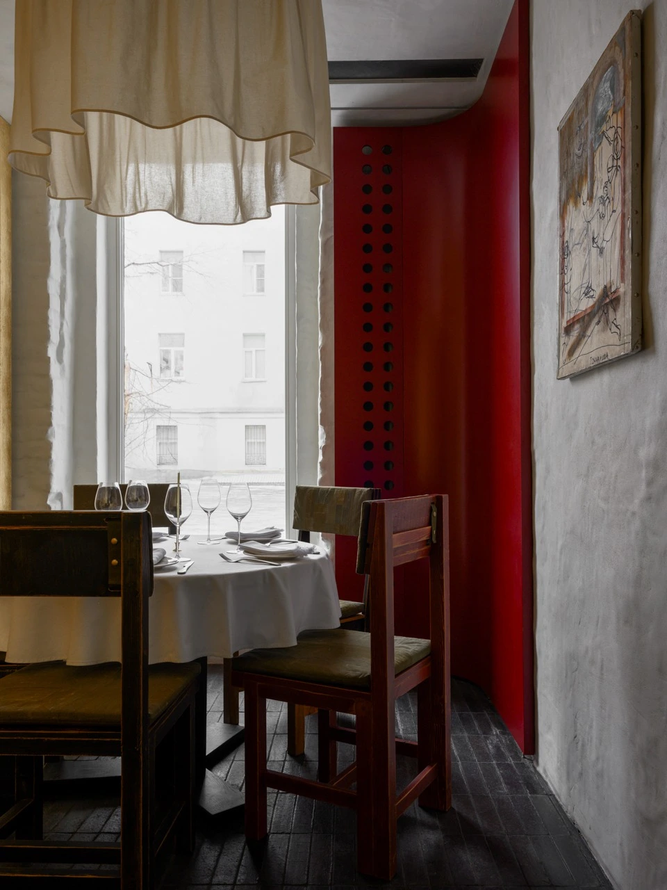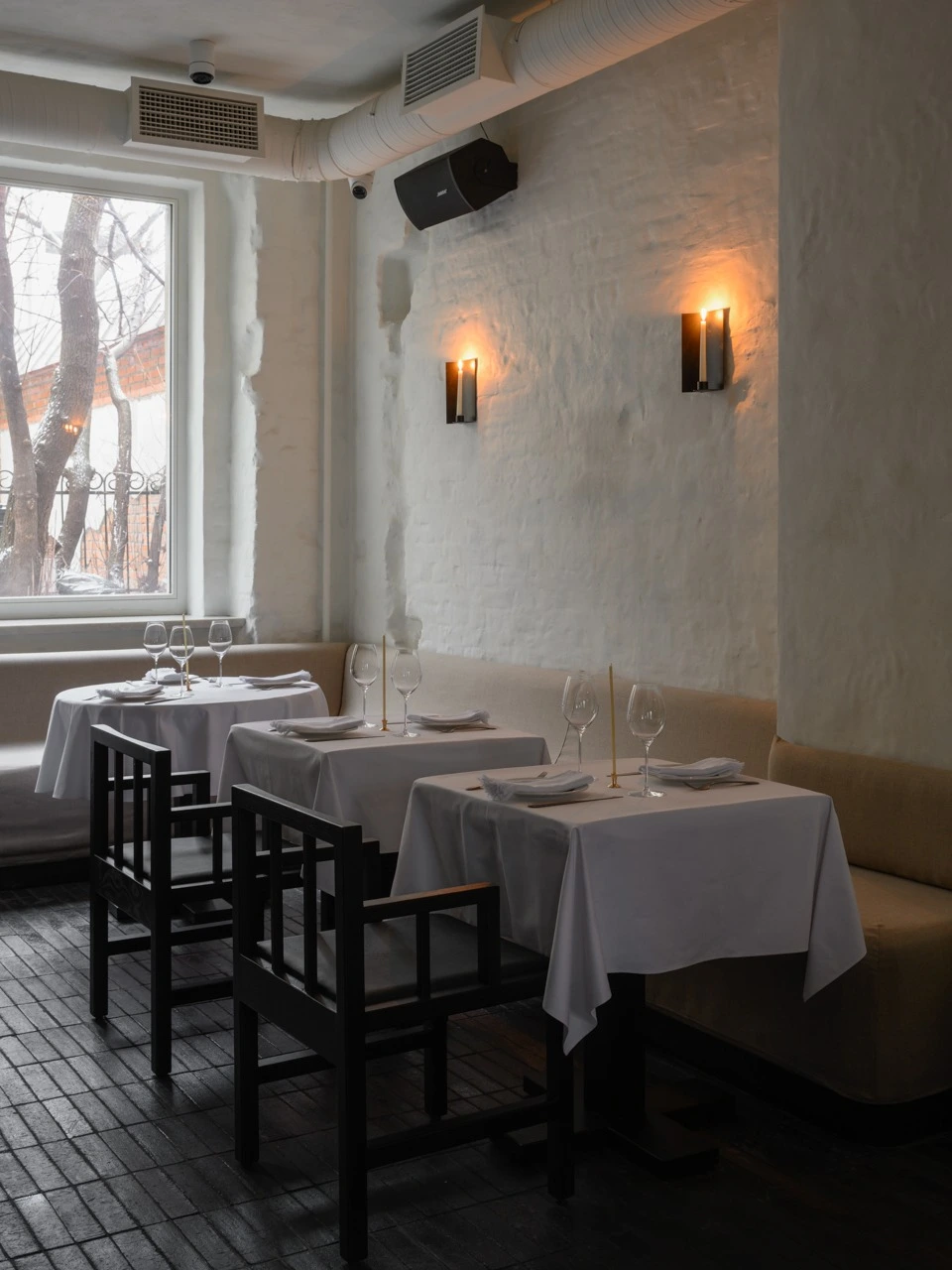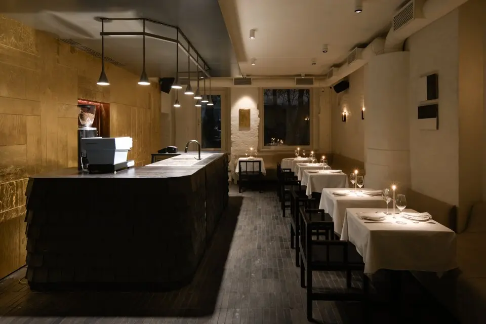 Спрятавшийся во дворах, на месте ресторана «Поколение», «ОКН» явно выделяется своим новогодним оформлением — как увидите елку в целлофане, значит, вы уже на месте. Стоит отметить, что весь интерьер заведения, начиная от той самой елки, соткан из таких причудливых деталей: мазанка на стенах, свечи, которые оставляют на ней следы горения, барная стойка, декорированная деревянной черепицей, стулья, выкрашенные кофе, картины, покрытые кружевной занавесью или золотой поталью. Благодаря большим окнам пространство освещает преимущественно естественный свет — и есть в этом некая интимность, уединение даже в дневное время. Вечером место преображается благодаря теплому свету от свечей и грамотно выстроенному освещению, которое по большей части направлено в центр стола. И это позволяет немного отделиться от остальных гостей. Если же хотите максимально приватную атмосферу, есть комнатка со столиком на двоих, закрытая плотной кожаной шторой, через которую не проступит ни один взор или солнечный свет. Не уверены, что здесь комфортно будет ужинать, но пошептаться за коктейлем — вполне.