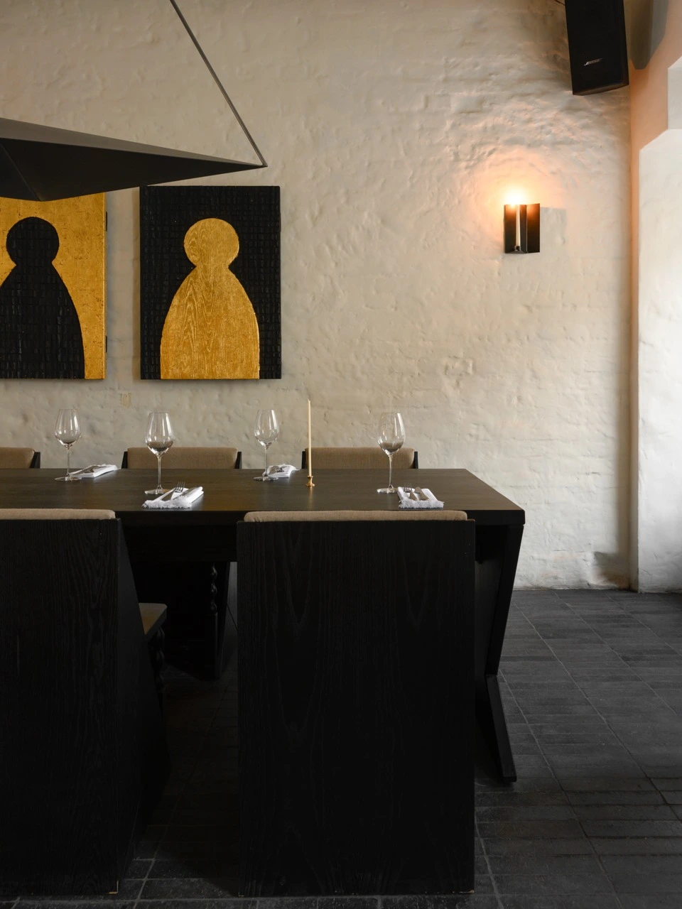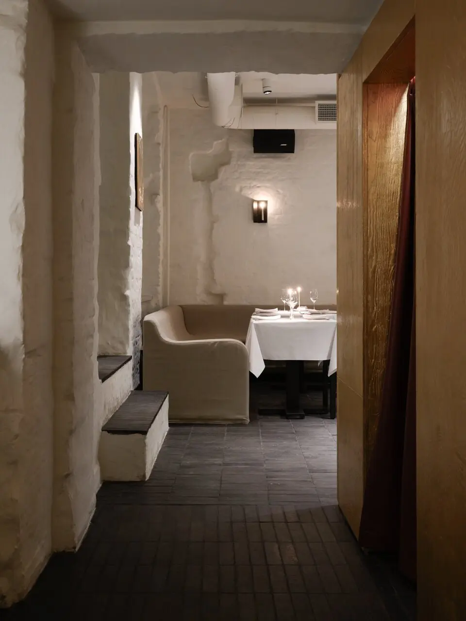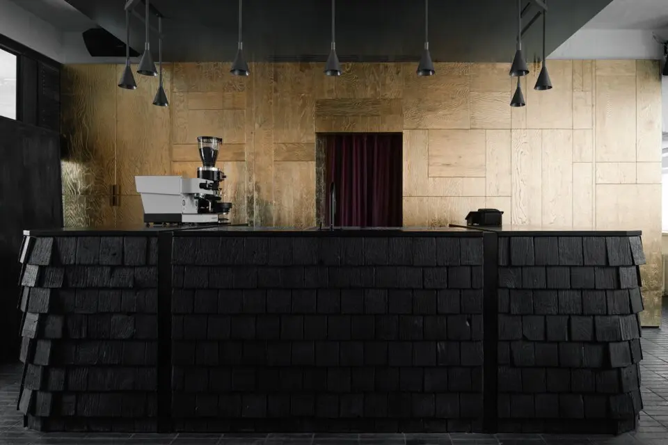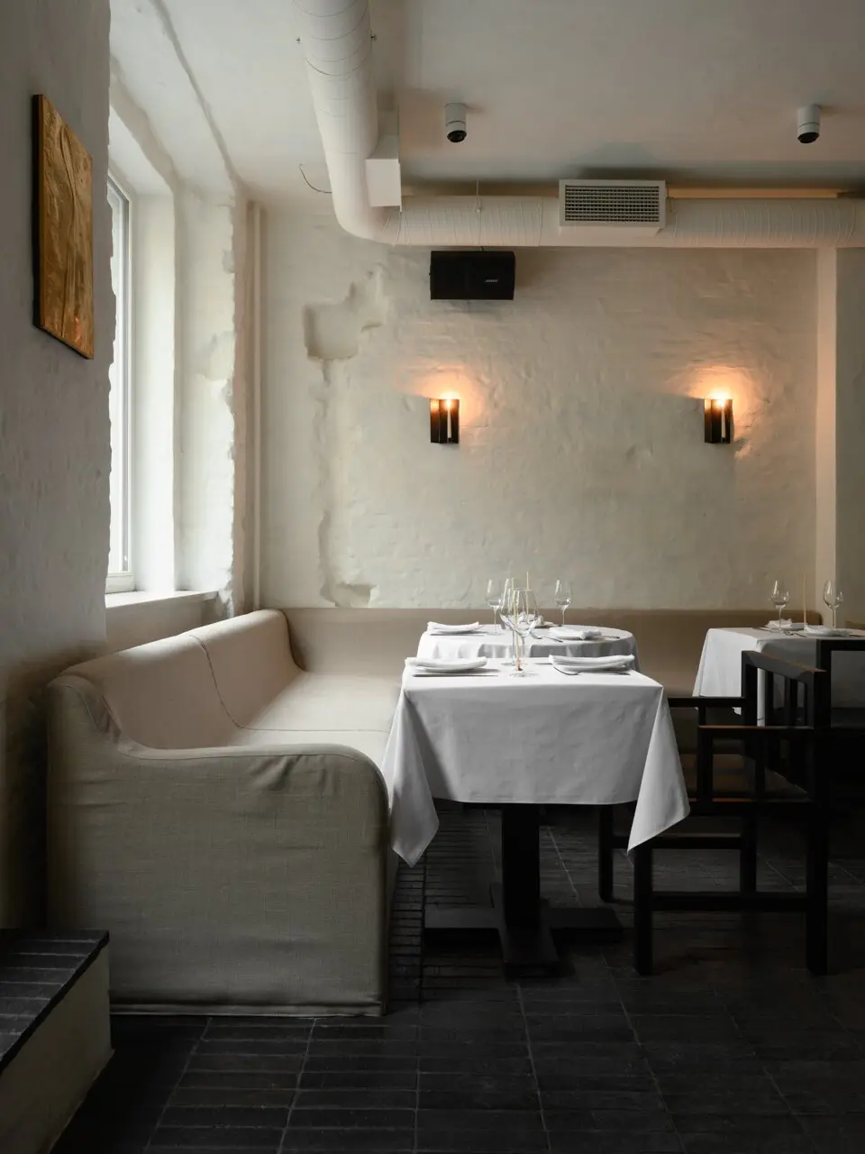 Спрятавшийся во дворах, на месте ресторана «Поколение», «ОКН» явно выделяется своим новогодним оформлением — как увидите елку в целлофане, значит, вы уже на месте. Стоит отметить, что весь интерьер заведения, начиная от той самой елки, соткан из таких причудливых деталей: мазанка на стенах, свечи, которые оставляют на ней следы горения, барная стойка, декорированная деревянной черепицей, стулья, выкрашенные кофе, картины, покрытые кружевной занавесью или золотой поталью. Благодаря большим окнам пространство освещает преимущественно естественный свет — и есть в этом некая интимность, уединение даже в дневное время. Вечером место преображается благодаря теплому свету от свечей и грамотно выстроенному освещению, которое по большей части направлено в центр стола. И это позволяет немного отделиться от остальных гостей. Если же хотите максимально приватную атмосферу, есть комнатка со столиком на двоих, закрытая плотной кожаной шторой, через которую не проступит ни один взор или солнечный свет. Не уверены, что здесь комфортно будет ужинать, но пошептаться за коктейлем — вполне.