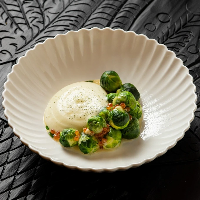 Шеф Игорь Гришечкин постарался собрать в своем меню узнаваемые сочетания и вкусы, но без прямого копирования традиционных блюд. Из того, что удалось попробовать, можем отметить салат с редисом, огурцом, зеленым горошком и домашней сметаной — максимально дачный и летний, но такой манящий в зимнее время, когда уже хочется свежих вкусов и легкости. Картофельные пончики с красной икрой — беспроигрышный вариант: хрустящее тесто, яркий картофельный вкус и пикантная солоноватость икры в сочетании со сметаной. Беленые пельмени с мраморной говядиной и соусом из черного перца — тоже классика, но тесто тут чуть плотнее, аромат и вкус благодаря соусу насыщеннее, а вид более презентабельный. Игорь как раз отметил, что ему не нравился серый оттенок теста после варки, а потому он решил добавить пищевой краситель. С ажурной тарелкой и фактурной лепкой пельмени выглядят как фарфоровые изделия.