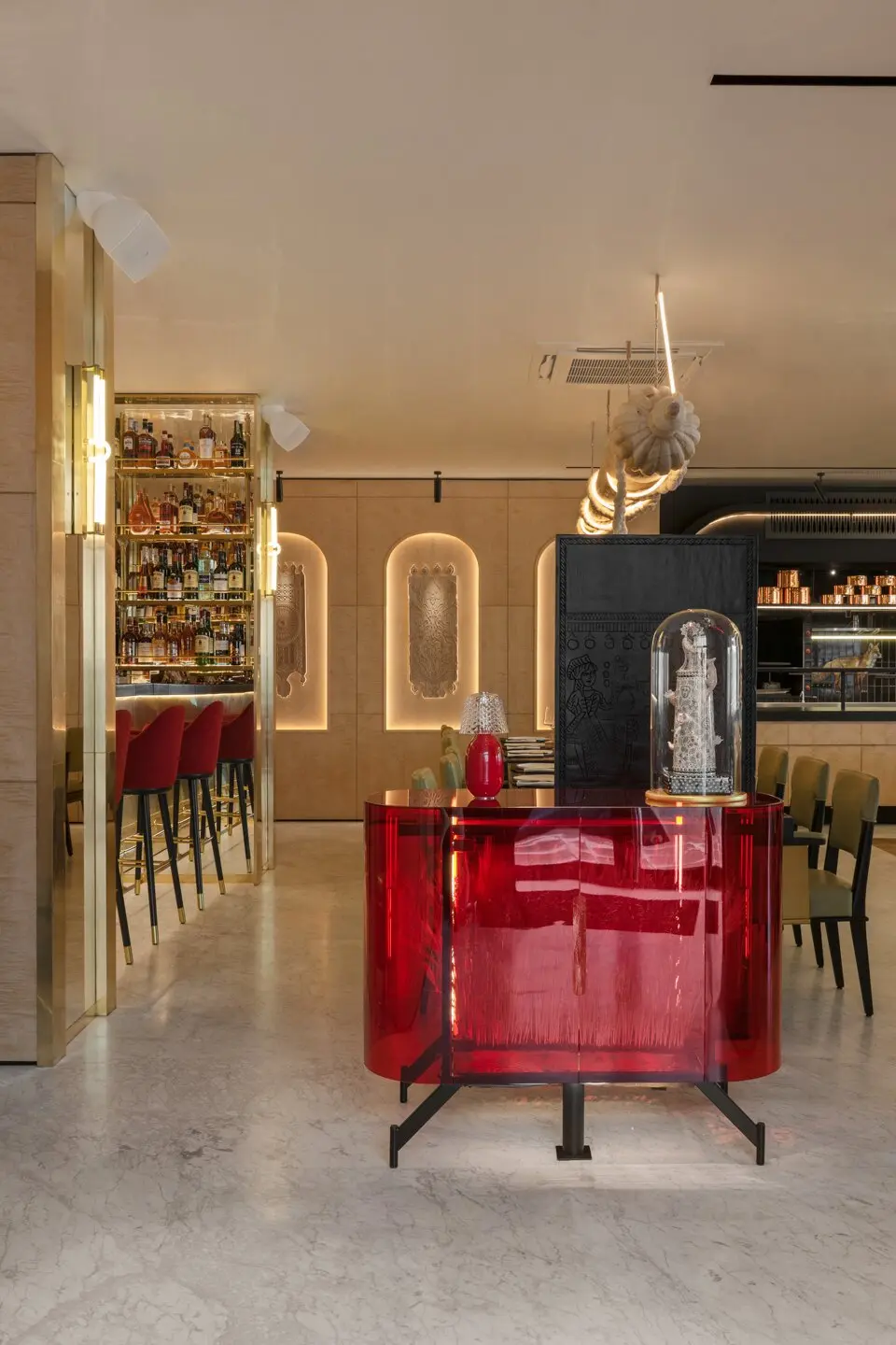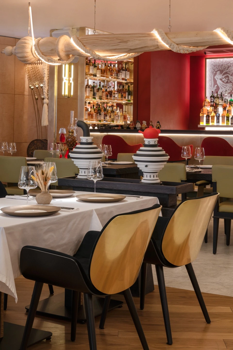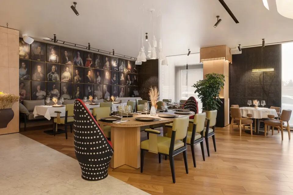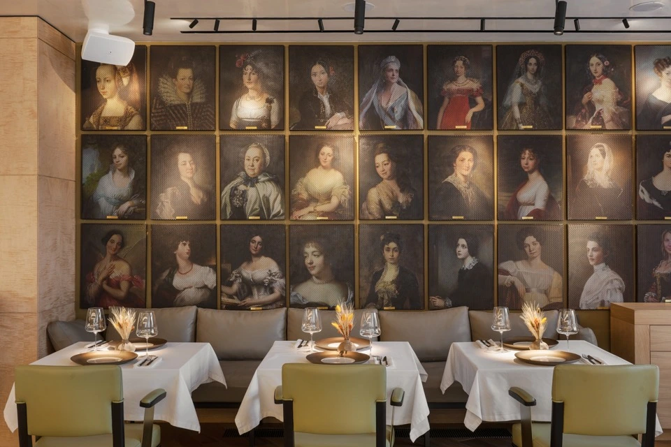 Спору нет, красиво! Светлое пространство пестрит отсылками к русской культуре: над винными холодильниками выглядывают Машеньки в кокошниках, на столах — резьба, на тарелках — колосья; целая стена отведена под коллекцию портретов Машенек разных эпох, оставивших свой след в истории; рядом с ними — оберег от сомнительных лиц, а в уборной — плетеный талисман, приносящий любовь, удачу и все, что только пожелаете. Но за мытьем рук не только на него обращаешь внимание, но и на цитаты, написанные на дверях, взятые из «Машеньки» Набокова. Деталей действительно много, но они не давят и не съедают пространство — идеальный баланс.