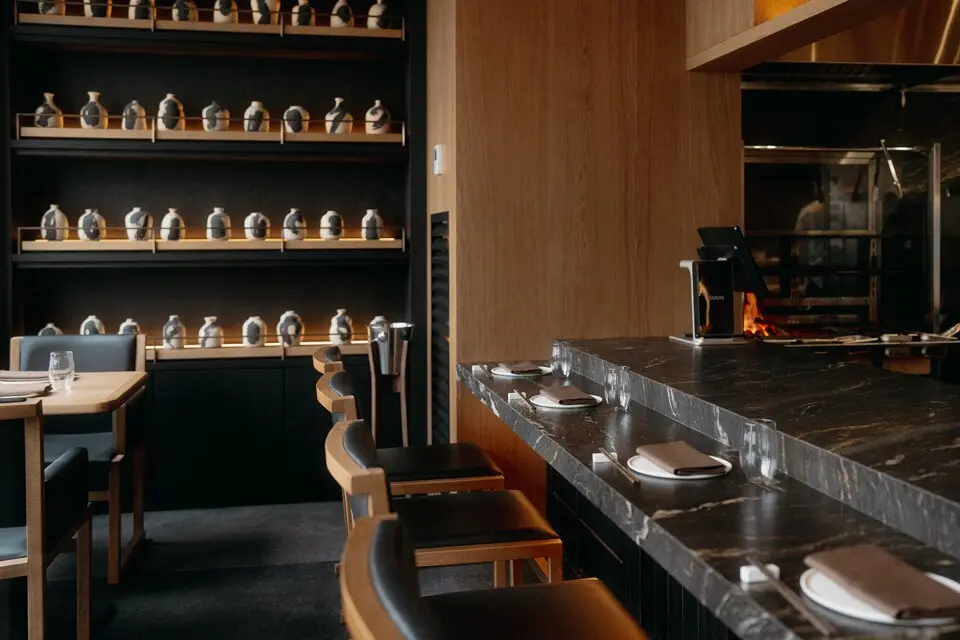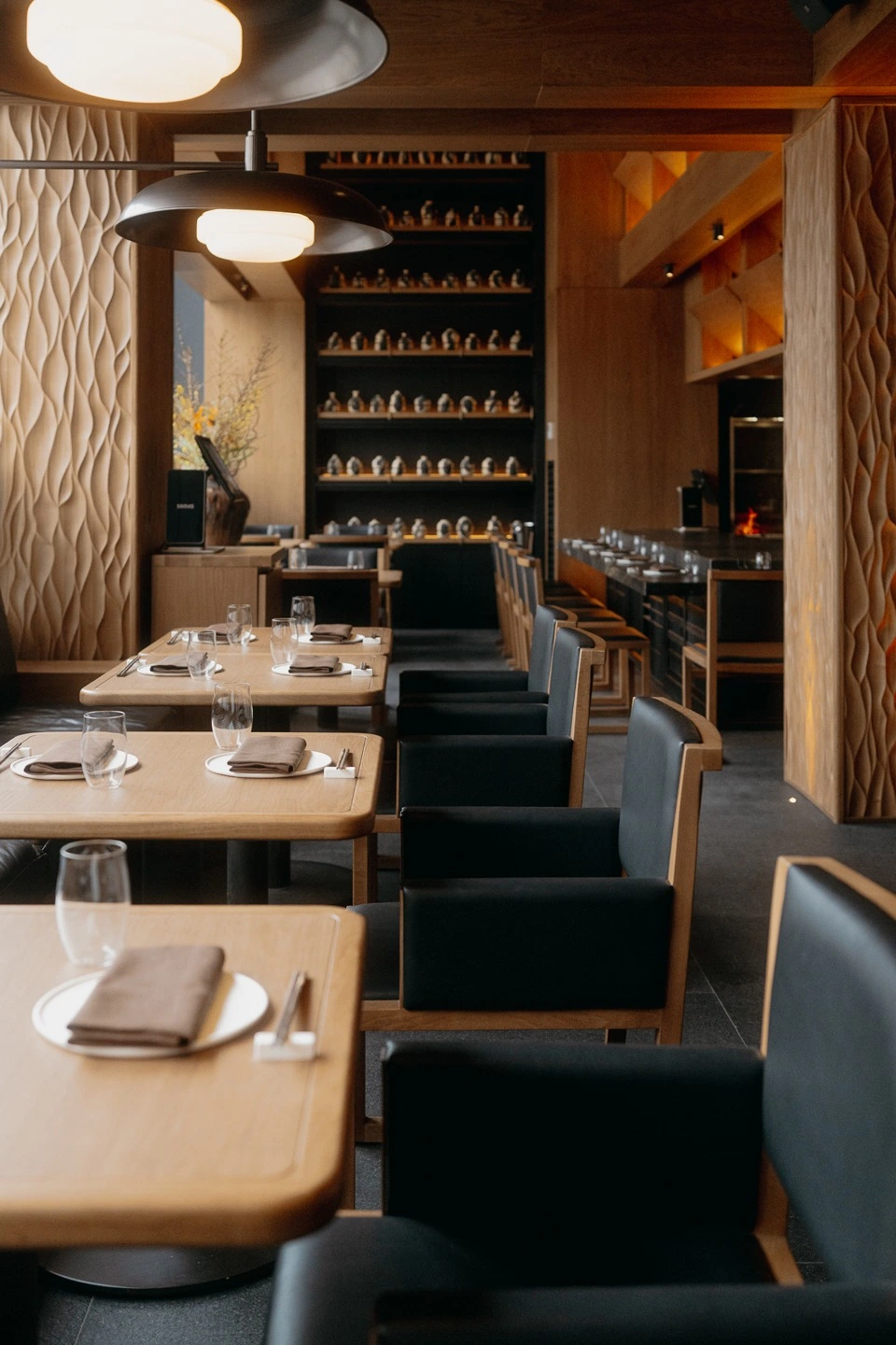 С японского Ima переводится «сейчас», и вот эта идея «быть в настоящем моменте» является ключевой концепцией места. Интерьер создавала команда Евгении Ужеговой, которая вдохновилась традиционной культурой и ремеслами. Идеальная, будто по линейке выверенная геометрия пространства: ровный ряд столов совпадает со старательно расставленными вазами ручной работы, колонны с волнообразным рисунком в вечернее время напоминают языки пламени, перекликаясь с огнем тэппана, а точечно выстроенный над каждым столом свет позволяет сделать идеальные фотографии ваших блюд. В интерьере нет лишних деталей, которые бы забирали на себя внимание от главного процесса.